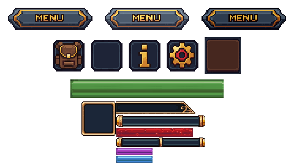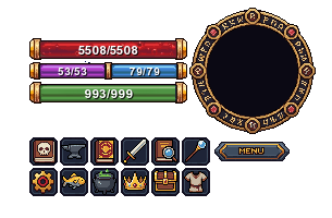 A complete dark-themed GUI kit for fantasy RPG games. Includes HUD elements, portrait frames, buttons, status bars, and icons.