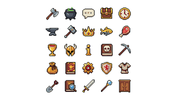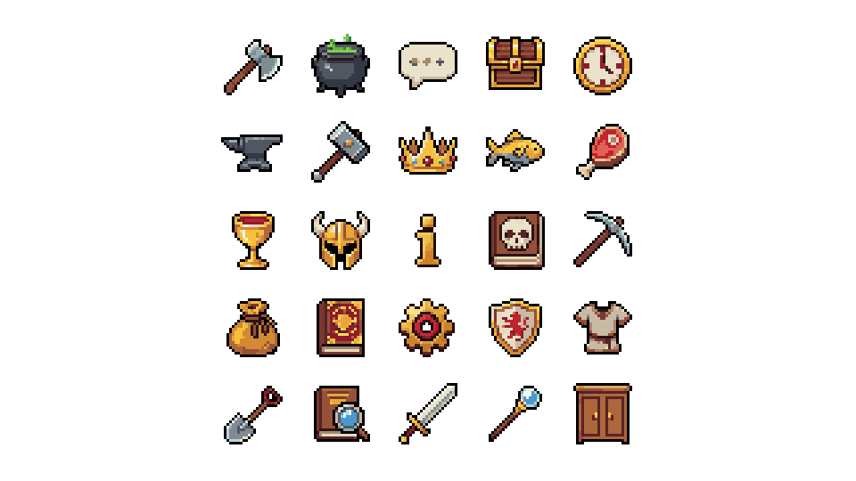 - Icons - 25 RPG icons including sword, axe, shield, helmet, wand, pickaxe, cauldron, chest, crown, and more
