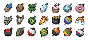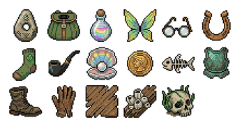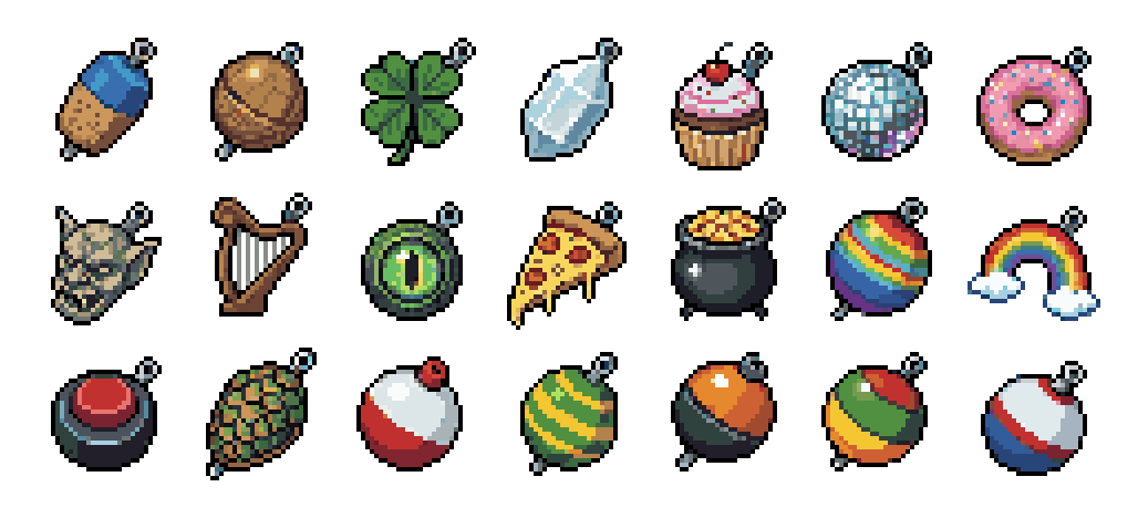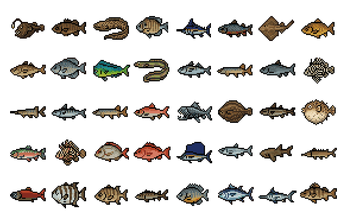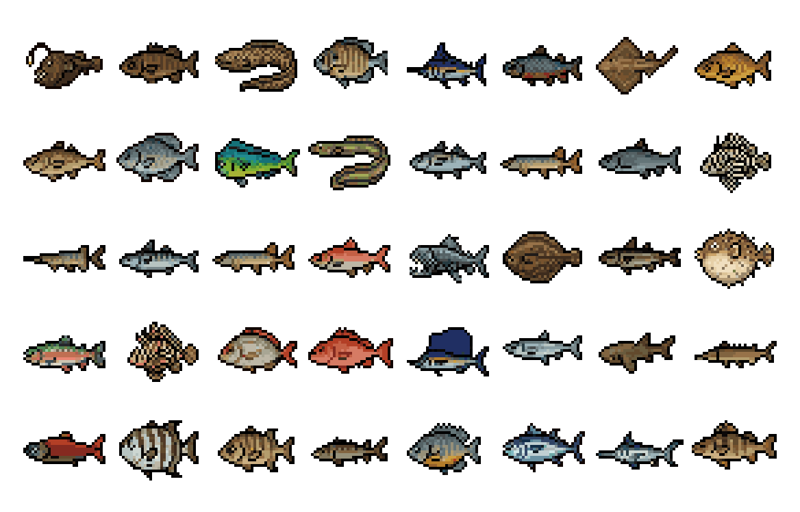 A collection of 90 pixel art fishing icons perfect for RPGs, idle games, or any project with a fishing mechanic. Covers a wide range of freshwater and saltwater catches, sea creatures, bobbers, junk items, and rare loot.