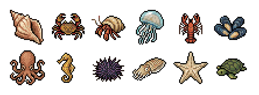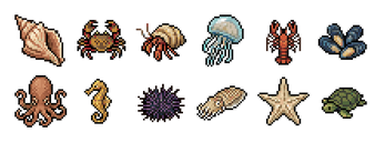 - Sea Creatures (12) - Crab, lobster, octopus, squid, jellyfish, seahorse, starfish, turtle, and others