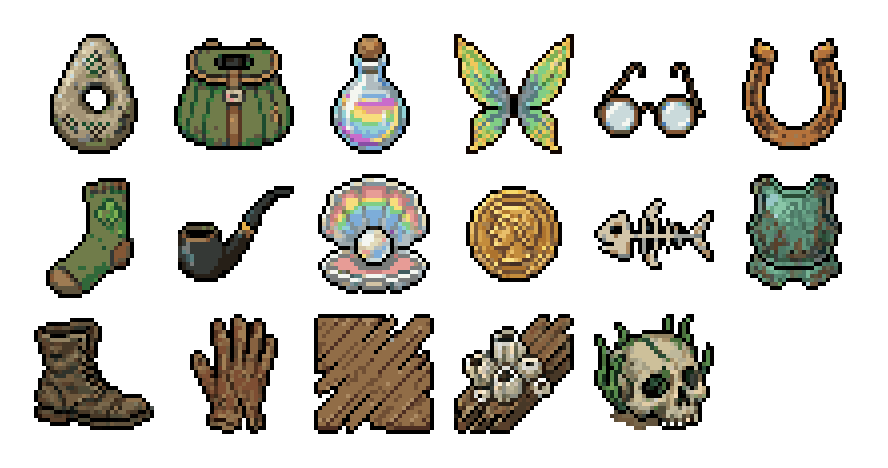 - Loot (9) - Rare and magical finds like adderstone, fairy wings, horseshoe, rainbow pearl, and bottled rainbow